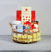 Wrap someone special in the warmth of the season with our Cozy Comforts Gift Basket. Presented in a 10” round iron-and-wood basket with jute handles, this elegant arrangement combines cozy textures with a festive touch. Inside, you’ll find the inviting Cinnamon Apple Spice reed diffuser by Aromabotanical, handcrafted artisan caramels, gourmet preserves, and other seasonal treats. Perfect for holiday gifting, client appreciation, or creating a warm and welcoming atmosphere at home.
