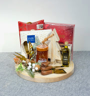 Elevate your holiday gifting with this beautifully curated Rustic Gourmet Holiday Tray. Presented on a 12” natural wood serving board, this elegant set combines festive charm with timeless taste. Inside, you’ll find premium truffle-infused olive oil, golden honey, a set of artisan cheese knives, and seasonal treats — all complemented by cozy winter accents and a wooden tree ornament. Perfect for holiday entertaining or as a thoughtful gift for food lovers and hosts alike.